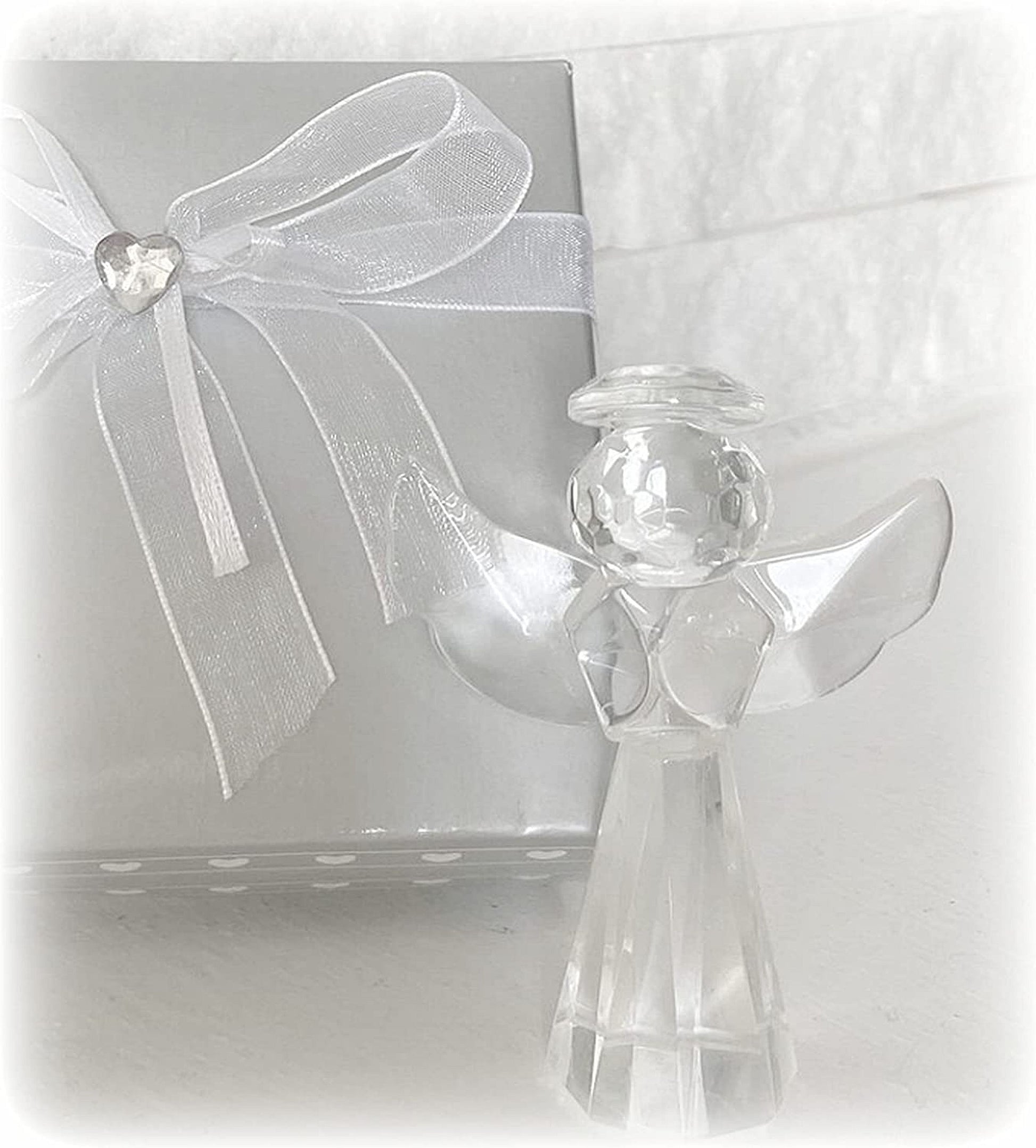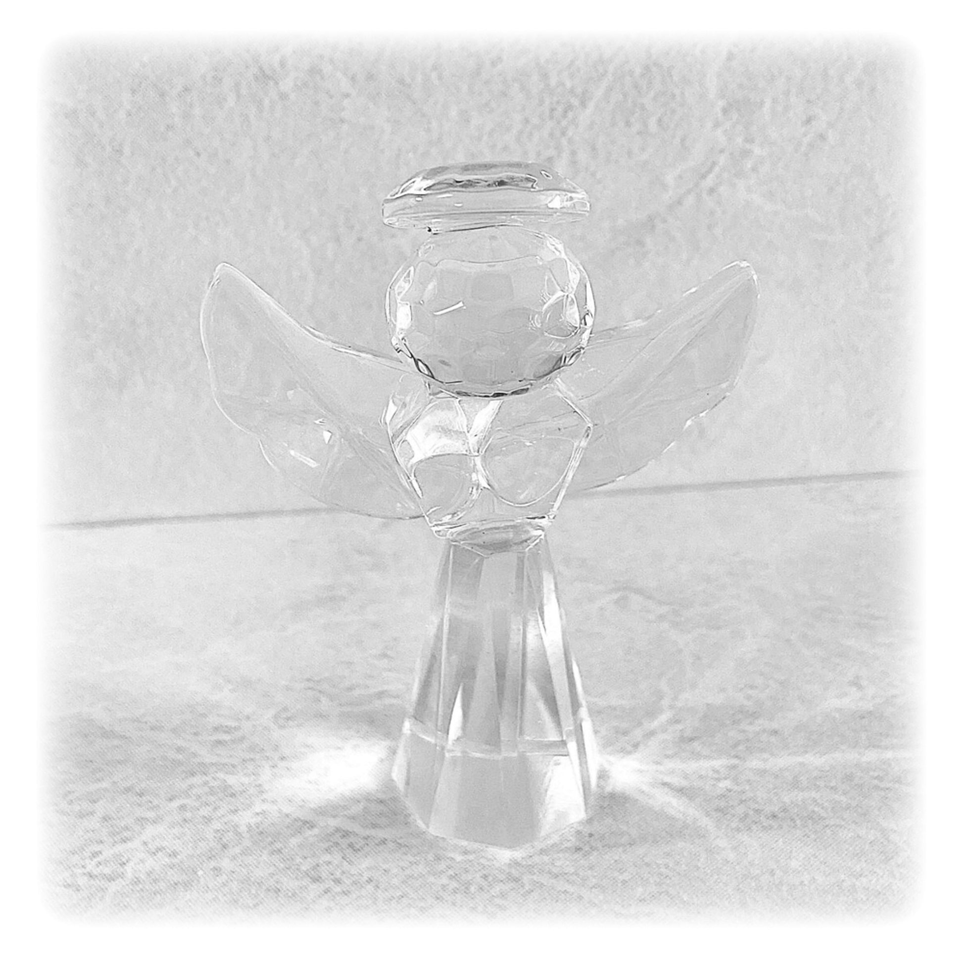 Measures 3" x 2 1/8" and is made of brilliant multi-faceted crystal in the shape of a beautiful angel with outstretched wings and a glistening halo.