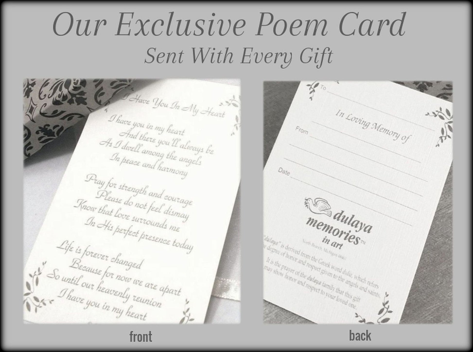 Our exclusive "I Have You In My Heart" poem card with dedication on the back side (see image) is included with each gift.