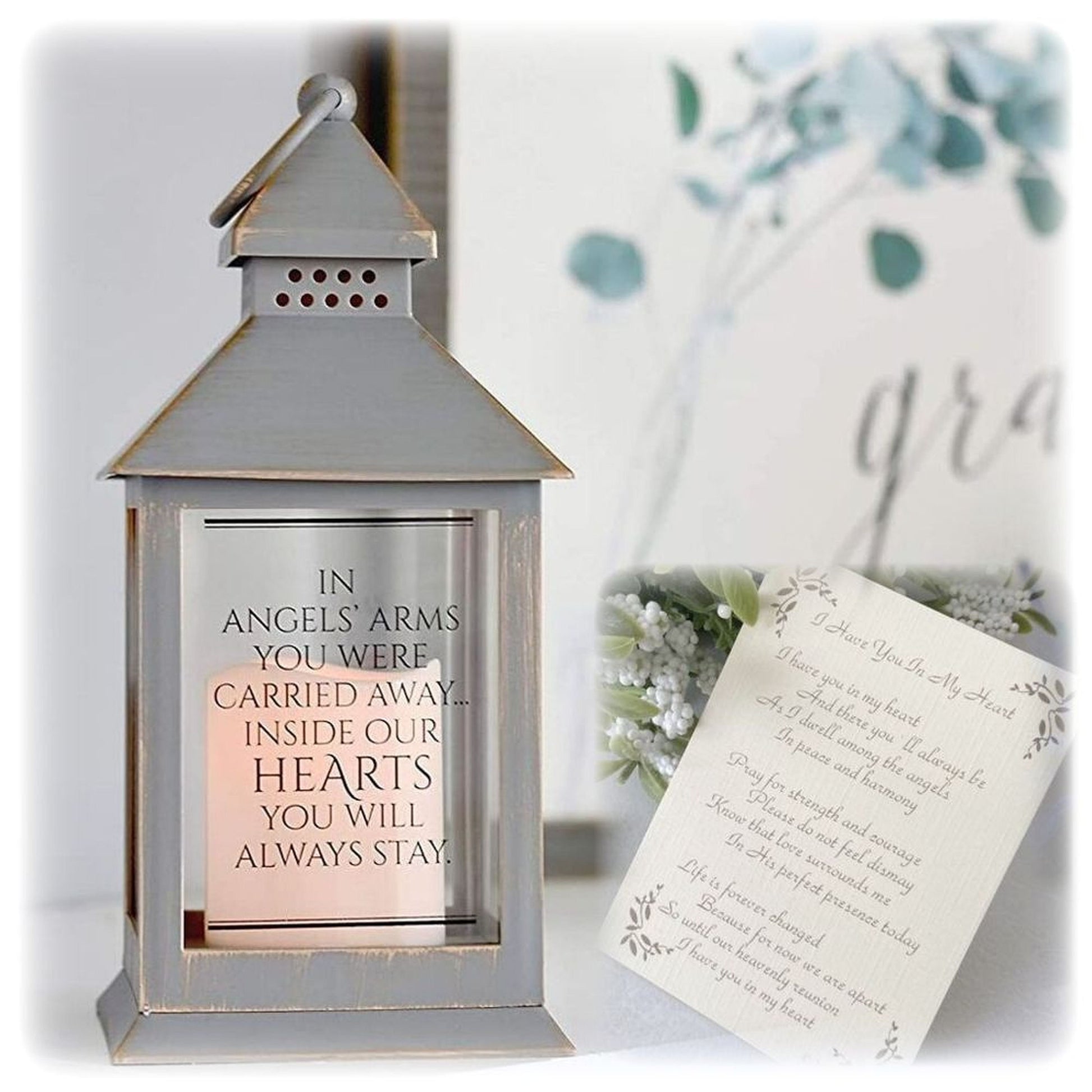 An inspirational gift that can be kept and treasured for years to come. Message printed on the face of the lantern: "In angels arms you were carried away inside our heart you will always stay."