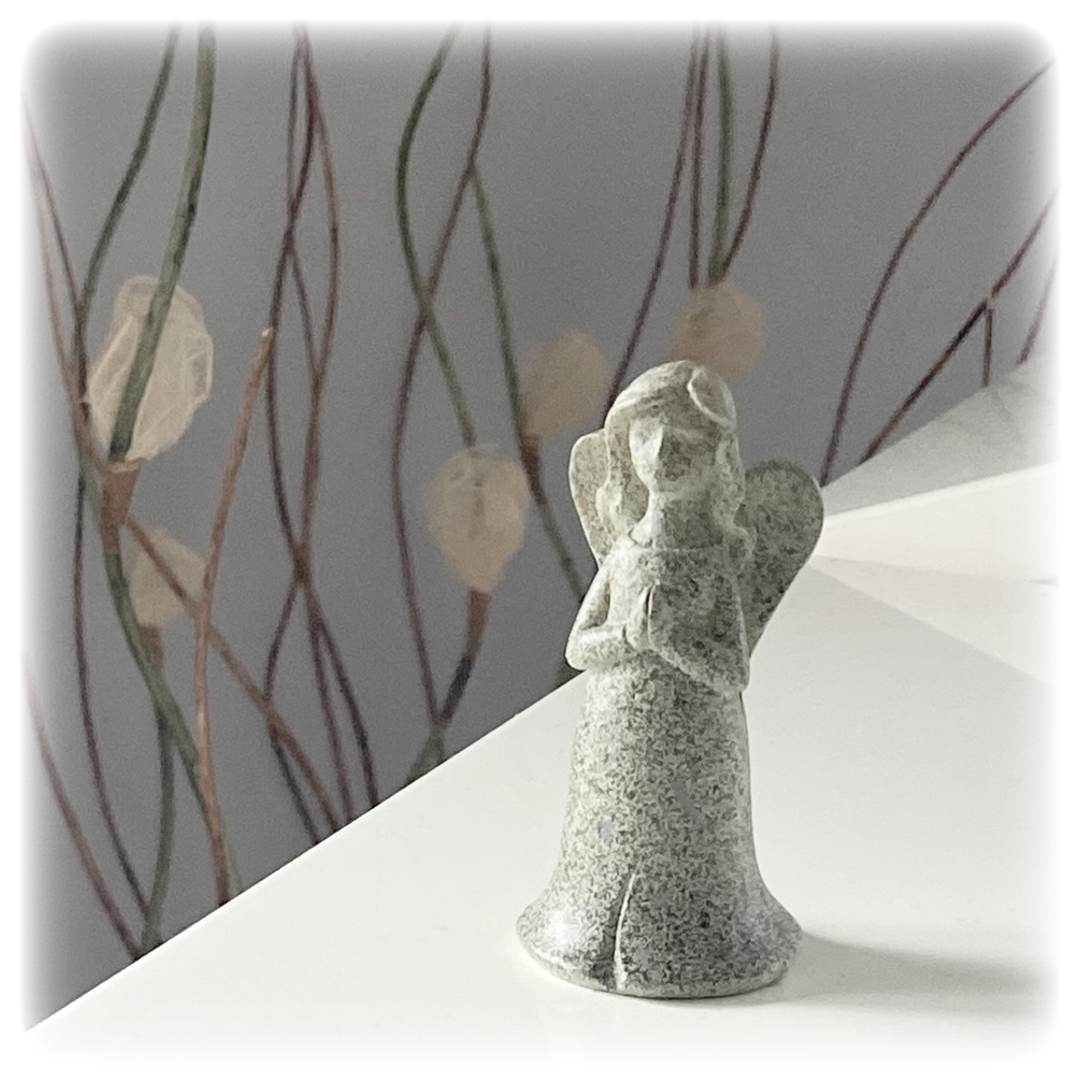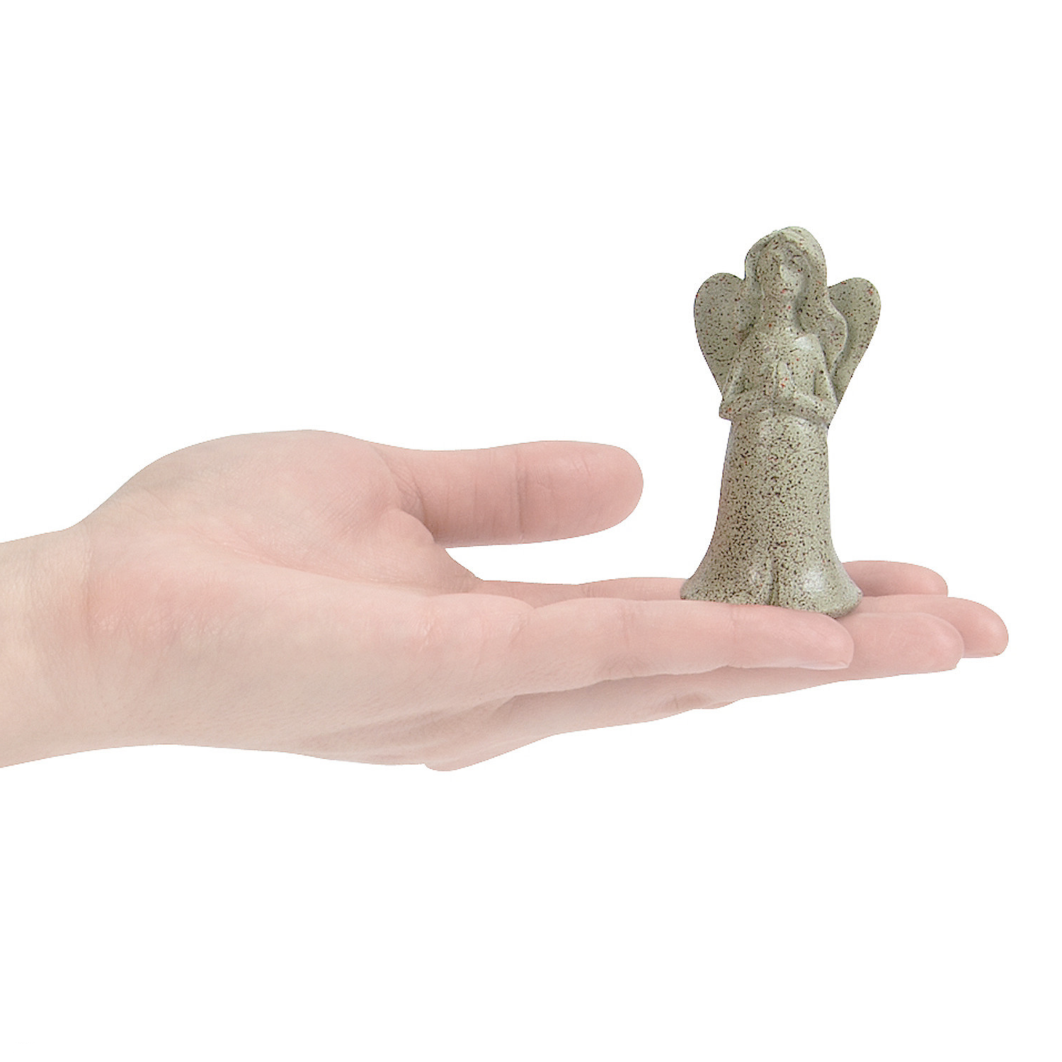 Measures 3" x 2 1/8" and is made of resin-stonelike material in the shape of a beautiful angel with hands folded in prayer.