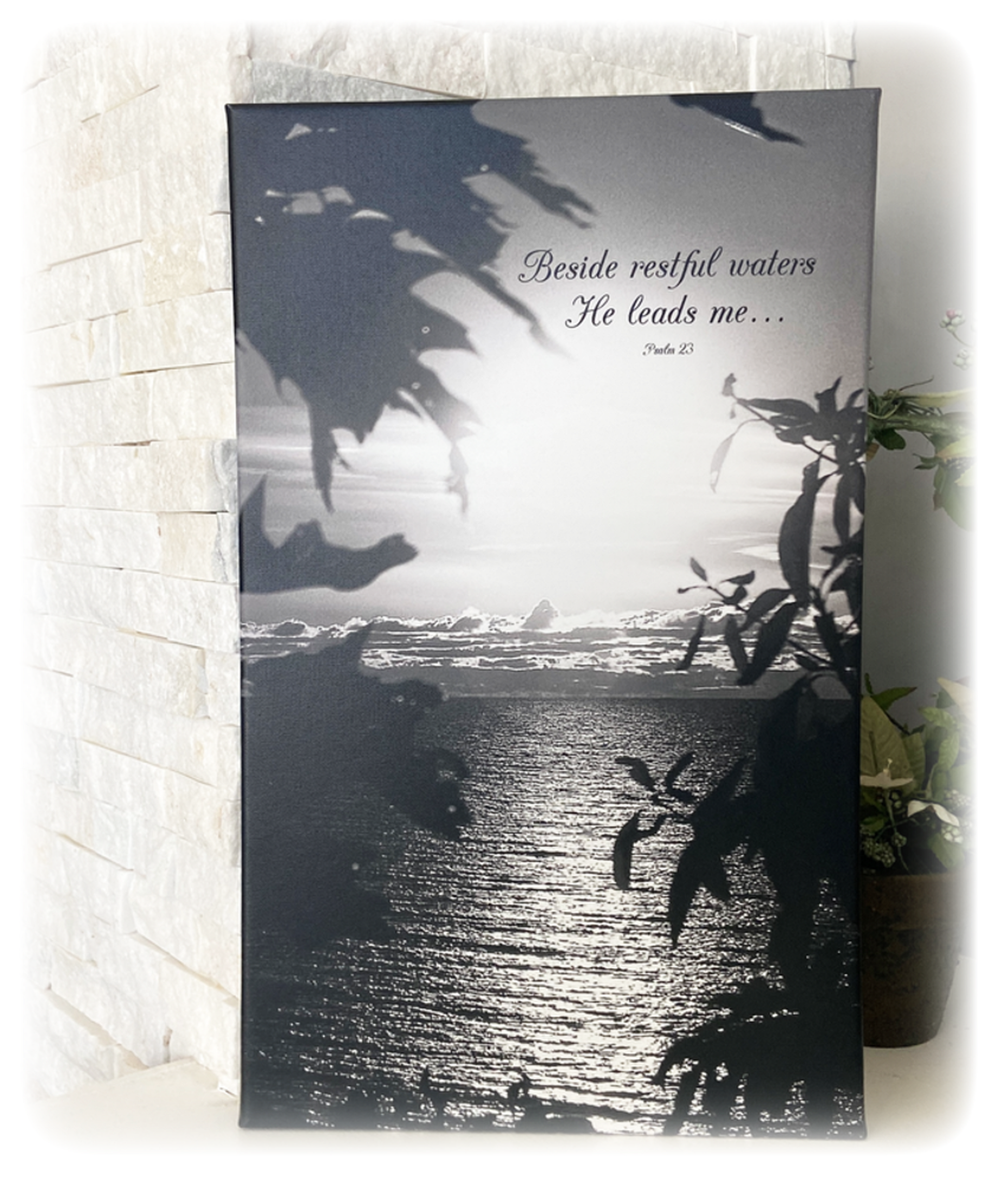 Scripture on canvas: Beside restful waters He leads me... Psalm 23.